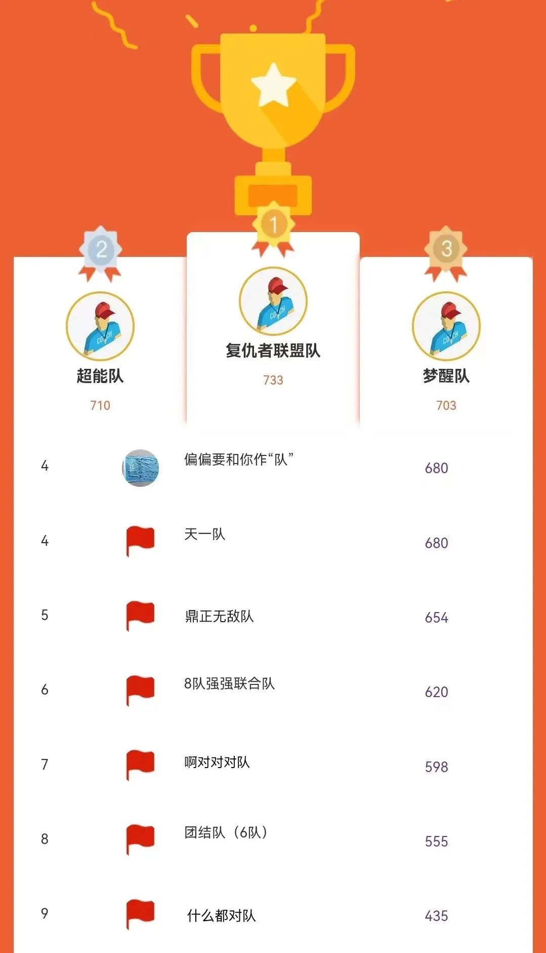 大家好,我們是“偏偏要和你作‘隊’”、“強(qiáng)強(qiáng)聯(lián)合隊”、“復(fù)仇者聯(lián)盟隊”、“鼎正無敵隊”、“啊對對對隊”、“超能隊”、“天一隊”、“團(tuán)結(jié)隊”、“夢醒隊”、“什么都對隊”。