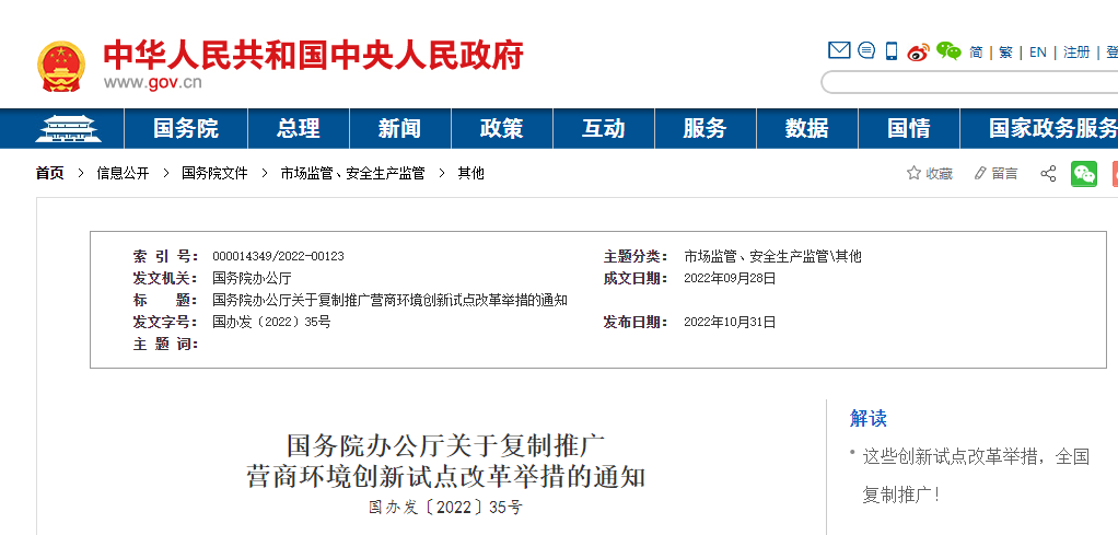 近日,國(guó)務(wù)院辦公廳發(fā)布關(guān)于復(fù)制推廣營(yíng)商環(huán)境創(chuàng)新試點(diǎn)改革舉措的通知。一是進(jìn)一步破除區(qū)域分割和地方保護(hù)等不合理限制,“清除招投標(biāo)和政府采購(gòu)領(lǐng)域?qū)ν獾仄髽I(yè)設(shè)置的隱性門(mén)檻和壁壘”,二是健全更加開(kāi)放透明、規(guī)范高效的市場(chǎng)主體準(zhǔn)入和退出機(jī)制,三是持續(xù)提升投資和建設(shè)便利度,“推進(jìn)社會(huì)投資項(xiàng)目‘用地清單制’改革”、“分階段整合相關(guān)測(cè)繪測(cè)量事項(xiàng)”、“推行水電氣暖等市政接入工程涉及的行政審批在線(xiàn)并聯(lián)辦理”、“開(kāi)展聯(lián)合驗(yàn)收‘一口受理’”、“進(jìn)一步優(yōu)化工程建設(shè)項(xiàng)目聯(lián)合驗(yàn)收方式”、“簡(jiǎn)化實(shí)行聯(lián)合驗(yàn)收的工程建設(shè)項(xiàng)目竣工驗(yàn)收備案手續(xù)”、“對(duì)已滿(mǎn)足使用功能的單位工程開(kāi)展單獨(dú)竣工驗(yàn)收”等。四是更好支持市場(chǎng)主體創(chuàng)新發(fā)展,五是持續(xù)提升跨境貿(mào)易便利化水平,六是維護(hù)公平競(jìng)爭(zhēng)秩序,七是進(jìn)一步加強(qiáng)和創(chuàng)新監(jiān)管,八是依法保護(hù)各類(lèi)市場(chǎng)主體產(chǎn)權(quán)和合法權(quán)益,九是優(yōu)化經(jīng)常性涉企服務(wù)。