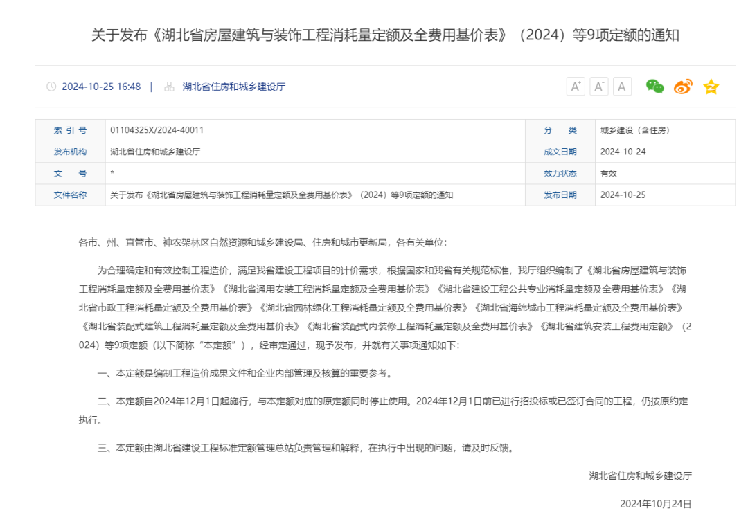 ▲《湖北省房屋建筑與裝飾工程消耗量定額及全費(fèi)用基價(jià)表》(2024)等9項(xiàng)定額正式發(fā)布