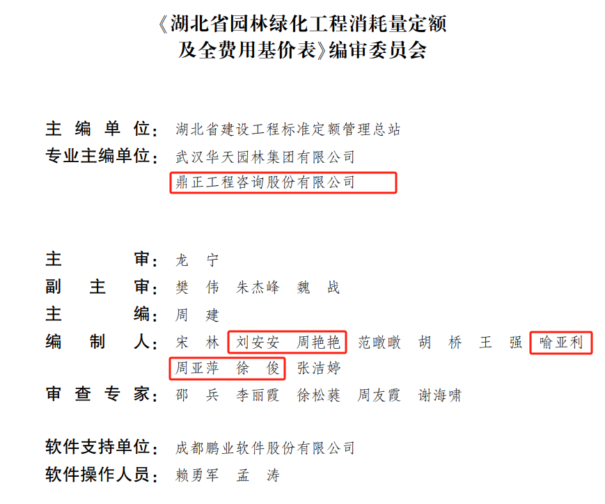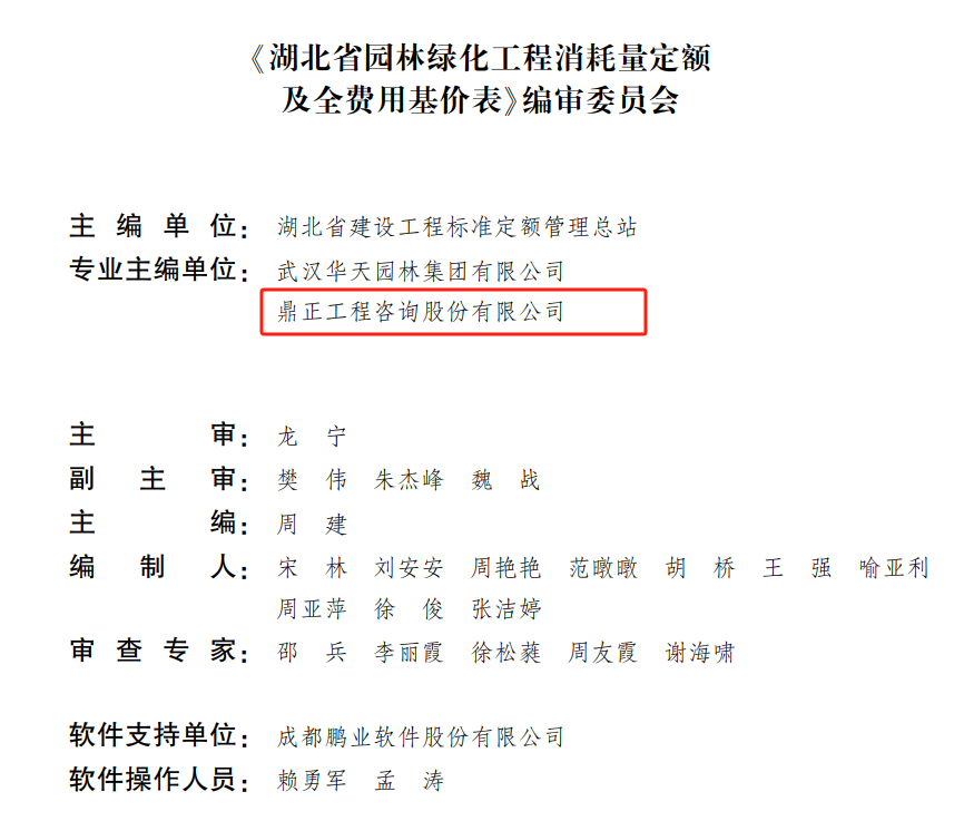 鼎正作為《湖北省園林綠化工程消耗量定額及全費(fèi)用基價(jià)表》《湖北省建筑安裝工程費(fèi)用定額》的參編單位之一,充分發(fā)揮全過程工程咨詢資源集中的優(yōu)勢(shì),為此次定額的修訂貢獻(xiàn)了鼎正在全過程工程咨詢、工程造價(jià)咨詢業(yè)務(wù)領(lǐng)域編審設(shè)計(jì)概算、投資估算、工程預(yù)算、過程結(jié)算、竣工結(jié)算等實(shí)踐經(jīng)驗(yàn),對(duì)進(jìn)一步完善工程造價(jià)計(jì)價(jià)依據(jù)體系提供了有力的技術(shù)支撐。