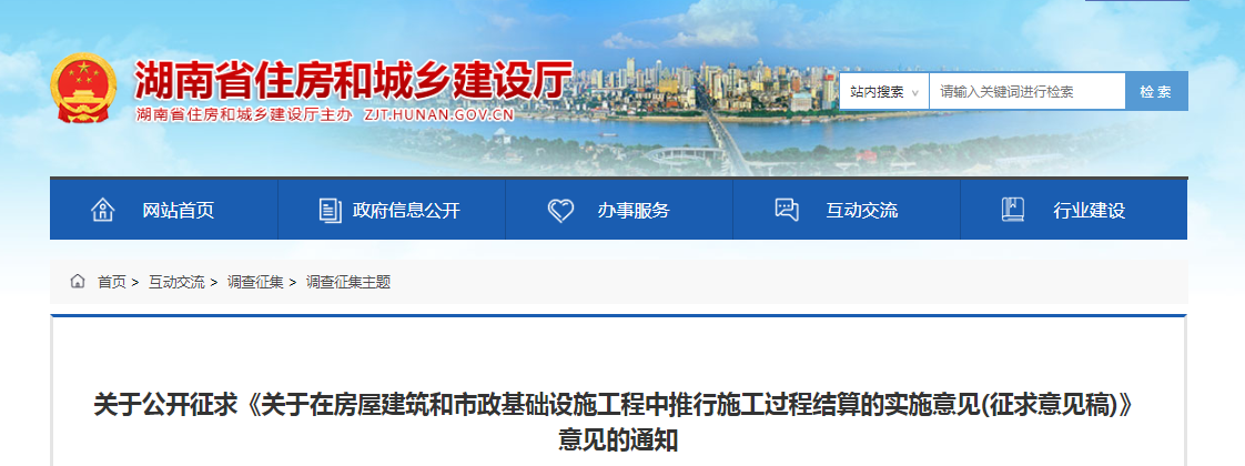 2020年5月28日,湖南省住建廳發(fā)布《關于在房屋建筑和市政基礎設施工程中推行施工過程結算的實施意見(征求意見稿)》,在省內房建、市政項目中全面推行施工過程結算。