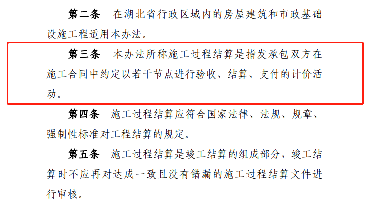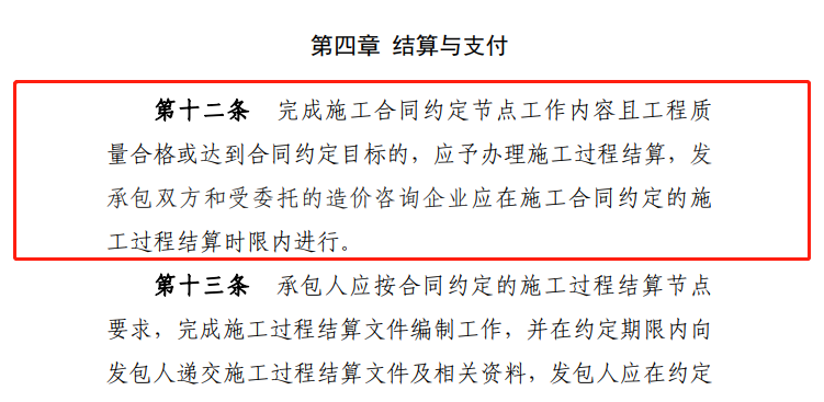本條定義何為施工過程結算,相較住建部2021年發布的《建筑工程施工發包與承包計價管理辦法》(修訂征求意見稿)第十九條規定“全面推行施工過程結算和支付。發承包雙方通過合同約定,按時間節點或進度節點對周期內已完成且無爭議的工程量進行價款計算、確認,并按照合同約定比例支付?!?span style=";margin: 0px; padding: 0px; outline: 0px; max-width: 100%;Helvetica Neue", "PingFang SC", "Hiragino Sans GB", "Microsoft YaHei UI", "Microsoft YaHei", Arial, sans-serif; text-align: justify; background-color: rgb(248, 248, 248); box-sizing: border-box !important; overflow-wrap: break-word !important;">《暫行辦法》增加了節點驗收,驗收是節點結算與支付的前提。