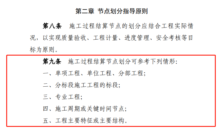 《暫行辦法》分為總則、節點劃分指導原則、招投標與合同約定、結算與支付、監督管理、附則等六個章節,共二十六個條文,具體如下