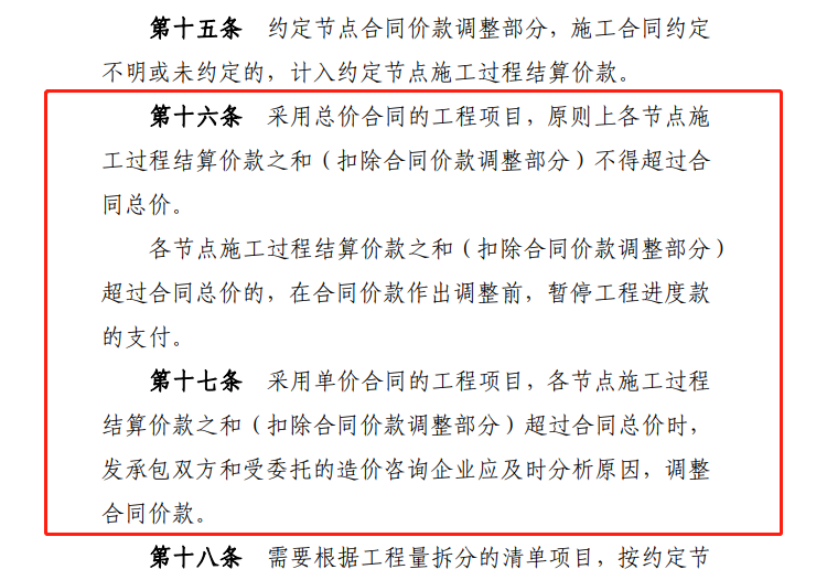 分別對總價合同的建設項目和單價合同的建設項目的施工過程結算的方式和過程進行解釋、說明??偠灾?,不管總價合同還是單價合同,施工過程結算價款之和(扣除合同價款調整部分)均不得超過合同總價,否則可能出現工程未完成已支付完成的情況。具體支付比例可根據發包人資金使用計劃在合同中約定,但不得低于當地行政主管部門的相關規定。