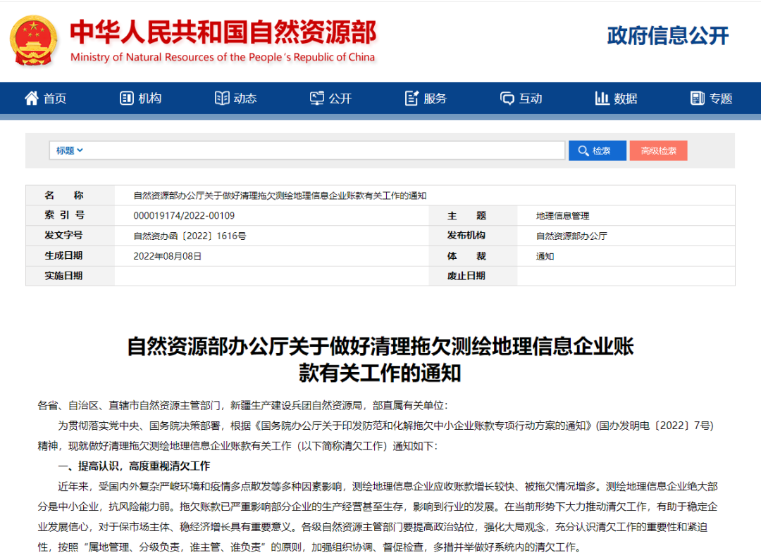 8月22日,自然資源部官網發布了《自然資源部辦公廳關于做好清理拖欠測繪地理信息企業賬款有關工作的通知》(自然資辦函〔2022〕1616號),部署做好清理拖欠測繪地理信息企業賬款有關工作。