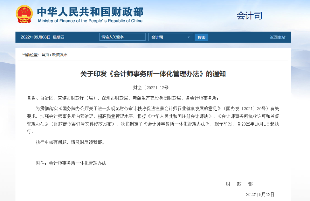 為貫徹落實(shí)《國務(wù)院辦公廳關(guān)于進(jìn)一步規(guī)范財務(wù)審計(jì)秩序促進(jìn)注冊會計(jì)師行業(yè)健康發(fā)展的意見》(國辦發(fā)〔2021〕30號)有關(guān)要求,加強(qiáng)會計(jì)師事務(wù)所內(nèi)部治理,提高質(zhì)量管理水平,根據(jù)《中華人民共和國注冊會計(jì)師法》、《會計(jì)師事務(wù)所執(zhí)業(yè)許可和監(jiān)督管理辦法》(財政部令第97號文件修改發(fā)布),我們制定了《會計(jì)師事務(wù)所一體化管理辦法》,現(xiàn)予印發(fā),自2022年10月1日起執(zhí)行。