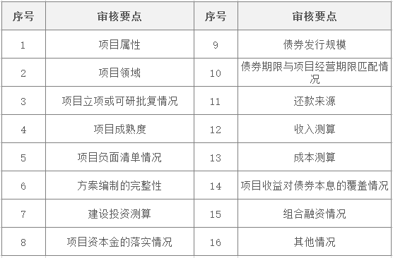 資料審核通過,進入發(fā)行庫,待發(fā)行。各省財政廳對發(fā)行文件進行審核,著重對《可研報告》與《實施方案》進行審核,審核要點如下:各省財政廳對項目的審批程序進行審核,項目達到開工條件后正式發(fā)行,審批程序審核事項清單如下: