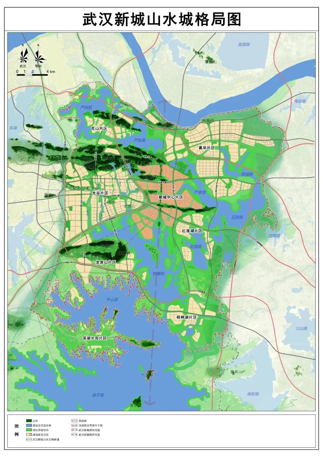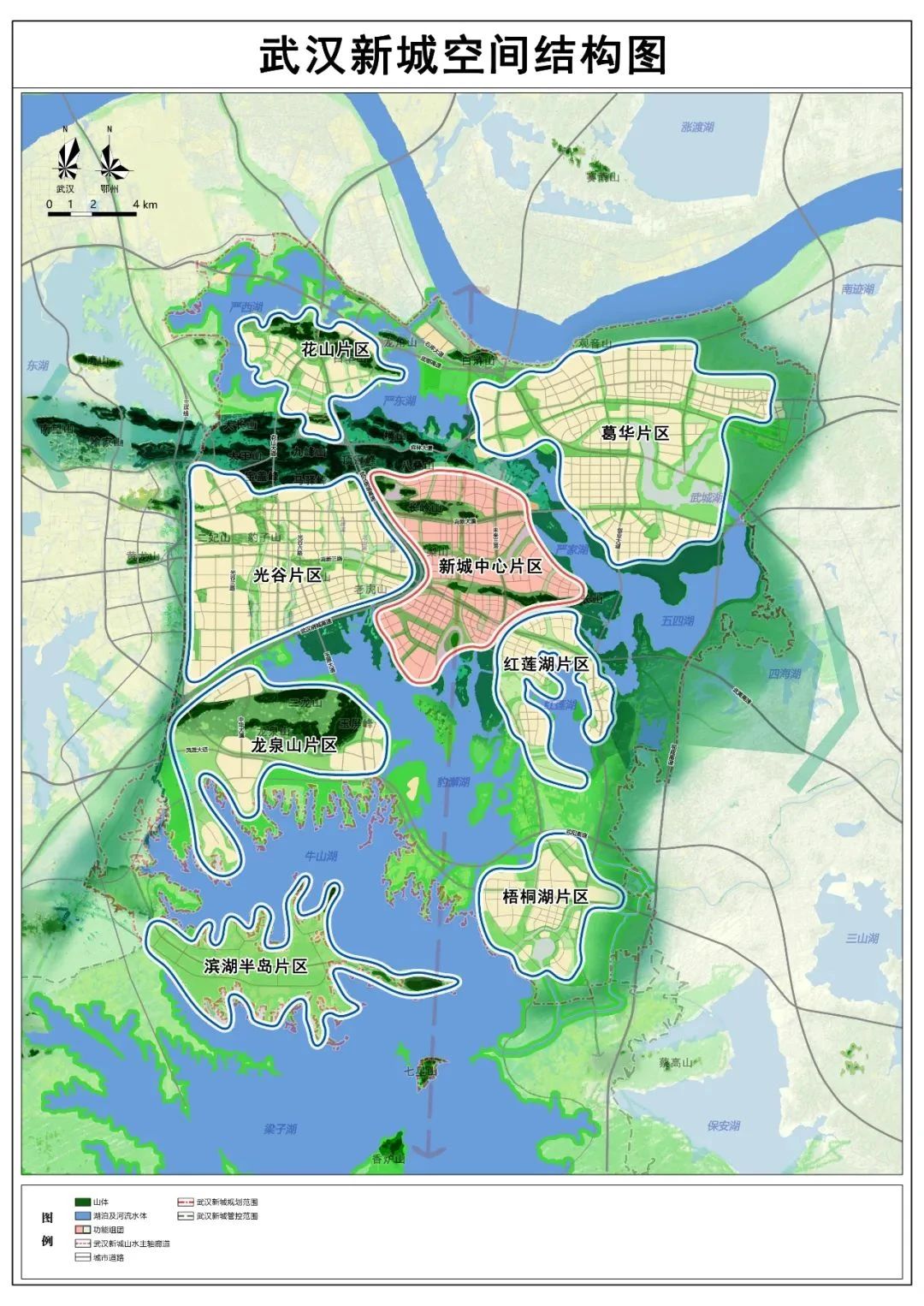 按照“山水城、家園城、智慧城”三大目標,構建山湖相映、組團發(fā)展的空間結構,劃分新城中心片區(qū)、光谷片區(qū)、葛華片區(qū)、花山片區(qū)、龍泉山片區(qū)、紅蓮湖片區(qū)、梧桐湖片區(qū)、濱湖半島片區(qū)共8大片區(qū),形成產(chǎn)城融合、功能復合的空間布局。