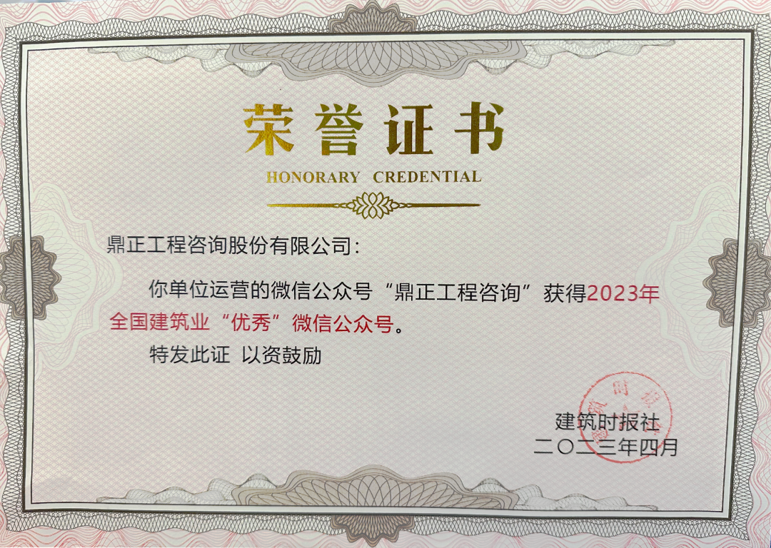 4月20日,由建筑時報主辦的2023年建筑業微信公眾號運維經驗交流研討會暨全國建筑業優秀公眾號頒獎典禮在廣西南寧舉辦。鼎正官方微信公眾號“鼎正工程咨詢”再度榮獲“全國建筑業優秀微信公眾號”榮譽稱號。