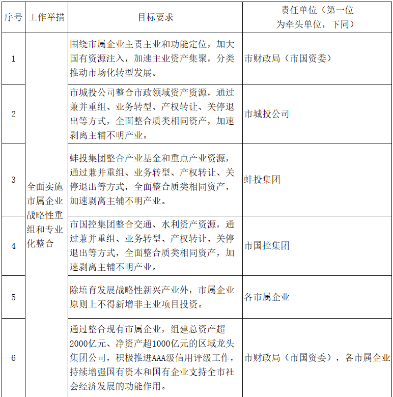1.全面實施市屬企業戰略性重組和專業化整合。圍繞市屬企業主責主業和功能定位,加大國有資源注入,加速主業資產集聚,分類推動市場化轉型發展。市城投公司整合市政領域資產資源,蚌投集團整合產業基金和重點產業資源,市國控集團整合交通、水利資產資源,通過兼并重組、業務轉型、產權轉讓、關停退出等方式,全面整合質類相同資產,加速剝離主輔不明產業。除培育發展戰略性新興產業外,市屬企業原則上不得新增非主業項目投資。在此基礎上,通過整合現有市屬企業,組建總資產超2000億元、凈資產超1000億元的區域龍頭集團公司,積極推進AAA級信用評級工作,持續增強國有資本和國有企業支持全市社會經濟發展的功能作用?!藏熑螁挝唬菏胸斦郑ㄊ袊Y委),各市屬企業〕
