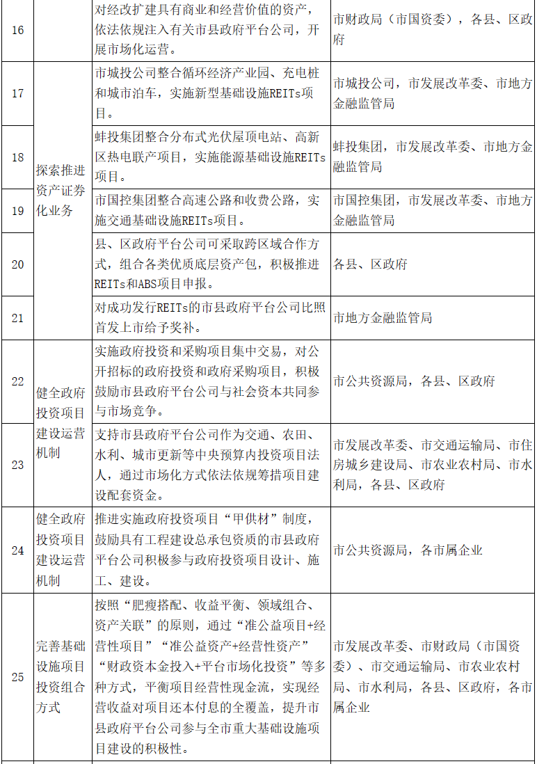 6.探索推進資產證券化業務。市城投公司整合循環經濟產業園、充電樁和城市泊車,實施新型基礎設施REITs項目;蚌投集團整合分布式光伏屋頂電站、高新區熱電聯產項目,實施能源基礎設施REITs項目;市國控集團整合高速公路和收費公路,實施交通基礎設施REITs項目??h、區政府平臺公司可采取跨區域合作方式,組合各類優質底層資產包,積極推進REITs和ABS項目申報。2025年底前,市屬企業力爭發行REITs不低于2支,募集資金規模不低于50億元。對成功發行REITs的市縣政府平臺公司比照首發上市給予獎補。(責任單位:市發展改革委、市地方金融監管局、各縣、區政府,各市屬企業)