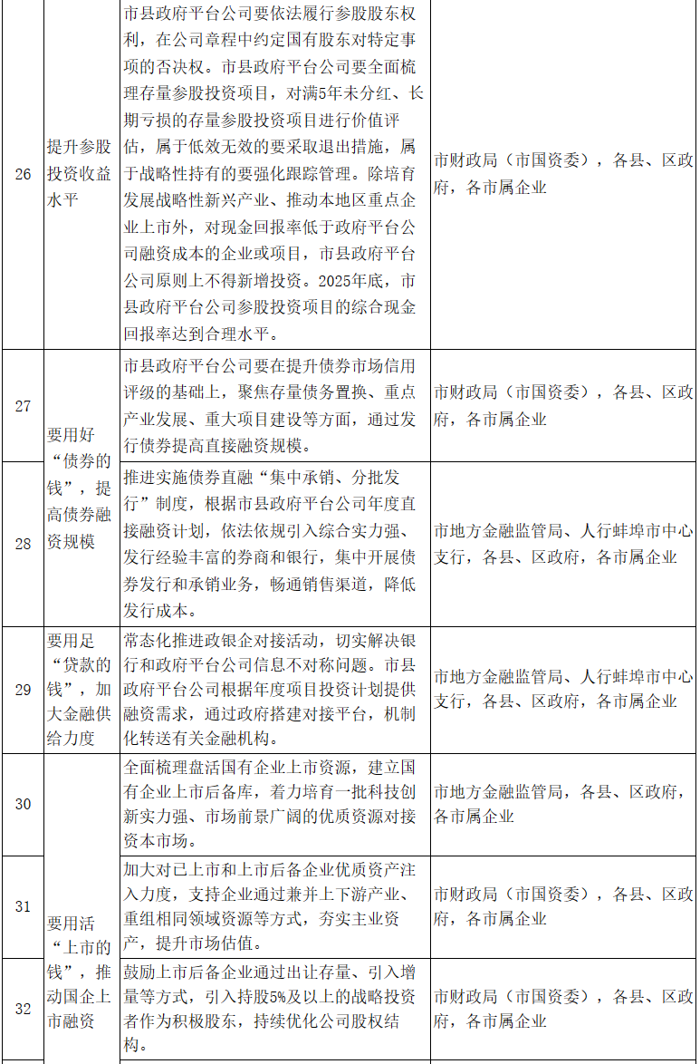 (四)持續提升融資能力。2025年底,市屬企業培育2戶以上國有控股企業在主要資本市場成功上市。市縣政府平臺公司直接融資規模超過300億元,間接融資規模超過400億元。