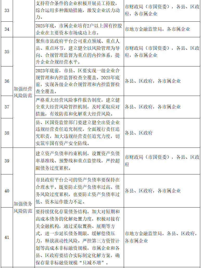 14.加強債務風險防范。建立健全資產負債率約束機制,設置資產負債率基準線、預警線和重點監管線,嚴控超限債務過度累積。市縣政府平臺公司的資產負債率要保持在合理水平,既要防止資產負債率過高、債務風險過度累積,也要防止資產負債率過低、資本運作能力不足。要持續優化存量債務結構,加大對短期和高成本債務的化解處置力度,積極對接有關金融機構,通過采取置換、展期等方式,進一步延長債務期限,緩解償債壓力,釋放流動性風險。嚴控第三方資管計劃等高成本非標融資規模,市屬企業和各縣、區政府要結合實際制定化解方案,確保存量非標融資規?!爸粶p不增”。〔責任單位:市財政局(市國資委)、市地方金融監管局,各縣、區政府,各市屬企業〕