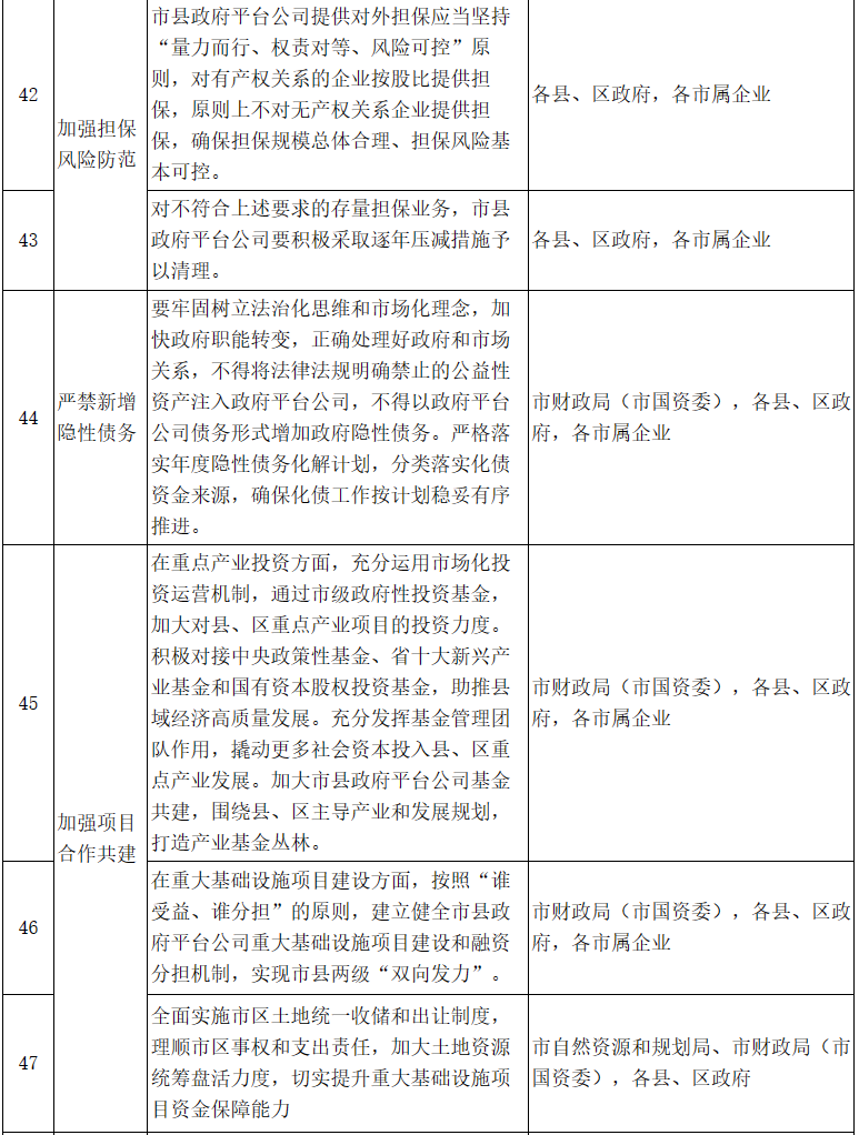 16.嚴禁新增隱性債務。要牢固樹立法治化思維和市場化理念,加快政府職能轉變,正確處理好政府和市場關系。不得將法律法規明確禁止的公益性資產注入政府平臺公司,不得以政府平臺公司債務形式增加政府隱性債務。嚴格落實年度隱性債務化解計劃,分類落實化債資金來源,確保化債工作按計劃穩妥有序推進?!藏熑螁挝唬菏胸斦郑ㄊ袊Y委),各縣、區政府,各市屬企業〕