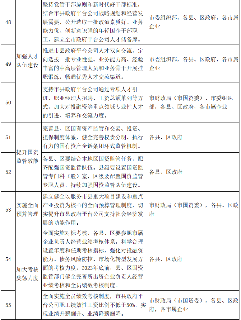 市縣政府平臺公司整合升級和市場化轉型“12345”行動計劃重點任務分工表