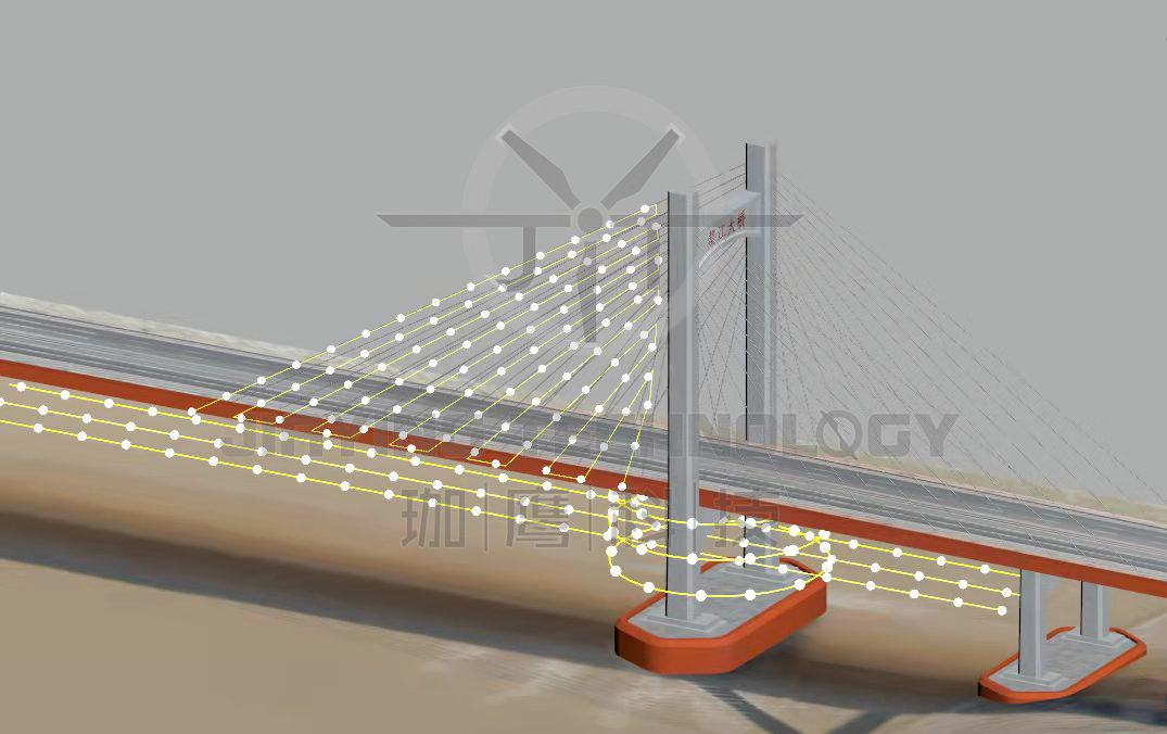 鰲江特大橋跨越鰲江口,主跨320米,主橋橋塔采用H型門式橋塔,索塔高為102.4米,相當(dāng)40層樓高,全橋共有96根斜拉索。就結(jié)構(gòu)特性而言,斜拉橋整體剛度遠(yuǎn)小于連續(xù)剛構(gòu)橋,因此通過智能檢測(cè)的手段收集病害信息至關(guān)重要。