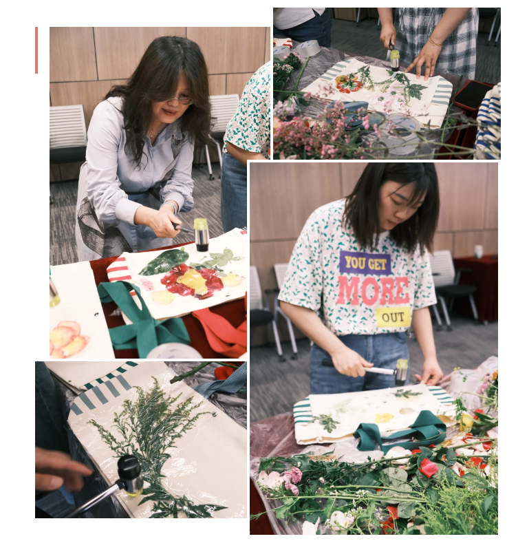 活動現(xiàn)場充滿了歡聲笑語,大家紛紛使出“洪荒之力”,咚咚咚…….伴隨著細(xì)碎的敲擊聲和花草香,一幅幅色彩斑斕的植物圖案躍然紙上。