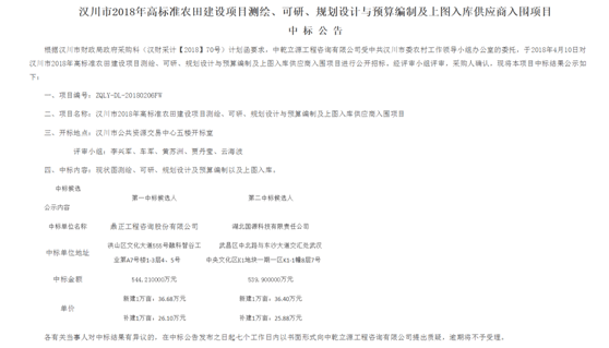 2018年4月11日,我司中標“漢川市2018年高標準農(nóng)田項目”,該項目位于湖北省漢川市,項目規(guī)模約17萬畝,對漢川市2018年高標準農(nóng)田建設項目進行測繪、可行性研究、規(guī)劃設計與預算編制,中標金額為544.21萬元,中標單價為新建1萬畝(36.68萬元)和補建一萬畝(26.10萬元)。